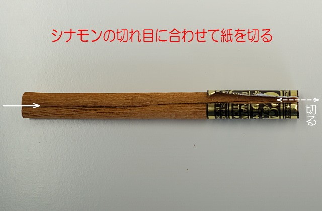 紙の切れ目から剥がすのではなく、シナモンスティックの切れ目に合わせて紙を切ります。カッターか小さく鋭い包丁の先など、鋭い刃物でスパッとカットしてください。