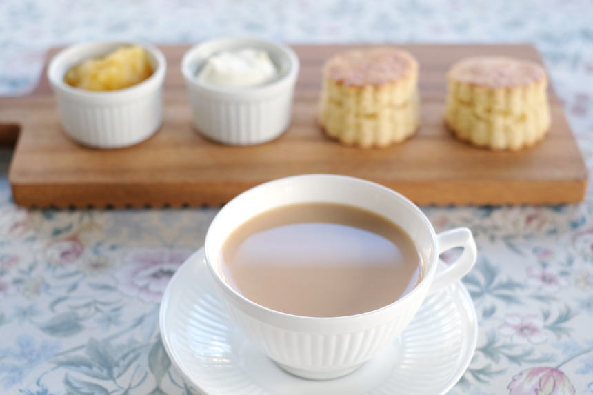 クロテッドクリームたっぷりのスコーンには、ストレートティーよりもミルクティーのほうが馴染みます。スコーン、クロテッドクリーム、ジャムにミルクティーを合わせることで味わいが広がり、口どけも良くなります。