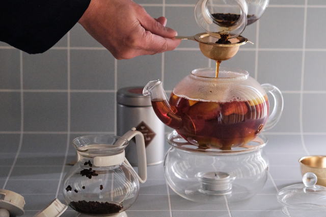 果物をジャンピングティーポットに入れ紅茶を注ぐ