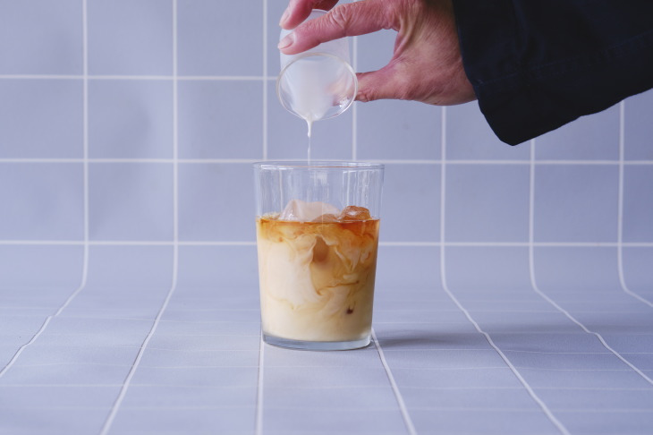 Step3=氷をいれたグラスに注ぎ、ミルクを注ぐ
