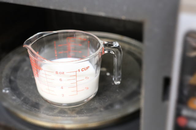 冷蔵庫でキンキンに冷えた牛乳を室温程度にするには、軽く温めるのが簡単です。