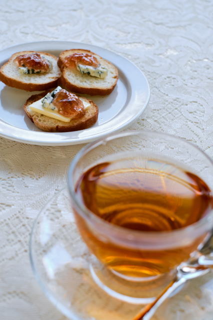 トーストしたバゲットに、ブルーチーズ、ローズジャムの順にのせ完成。ブルーチーズのコクと塩気にローズジャムの甘みと香りが絶妙。コクある味わいのダージリンセカンドフラッシュに実によく合います。